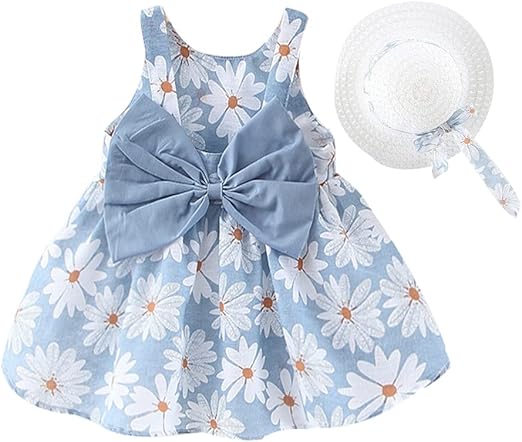 2.Baby Girl One-Piece Floral Dress with Lace Straw Hat Princess 2PCS Sleeveless Summer Skirt Clothes Set